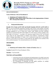 Rwanda NGO’s Forum on AIDS and Health Promotion (RNGOF on AIDS&HP), Job Advertisement: Monitoring and Evaluation Officer (1) and High-Risk Groups M malaria Project Field Officer for the Implementation of Malaria SBCC Strategic Interventions(5)