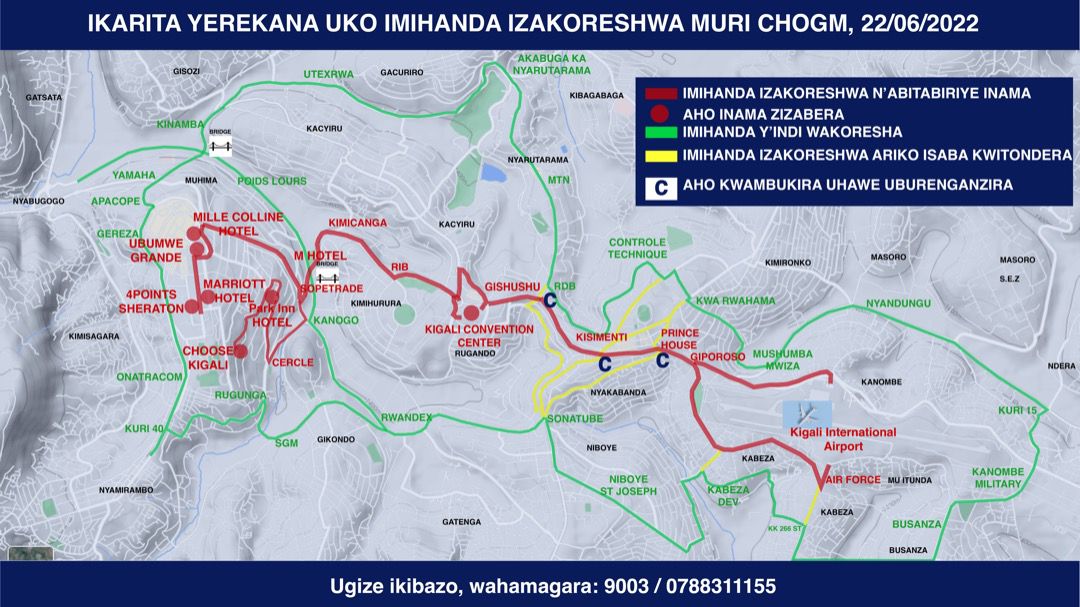 Ku wa Gatatu, tariki 22 Kamena, hari imihanda yo mu mujyi wa Kigali itazafungwa ku rujya n’uruza rw’ibinyabiziga, ariko abakoresha umuhanda barasabwa gutanga inzira bakabererekera abitabiriye inama ihuza abakuru b’ibihugu na za Guverinoma zo mu bihugu bikoresha ururimi rw’Icyongereza (CHOGM) igihe barimo gutambuka berekeza ahabera inama n’ibindi bikorwa bijyanye nayo.