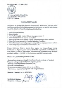 Imyanya 30 y`akazi Mukarere ka Bugesera: Deadline:07/10/2022