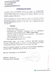 Ubuyobozi bwa GS ACEPER ikorera mukarere ka Nyamagabe, buramenyesha abantu bose babyifuza kandi babifitiye ubushobozi ko hari imyanya ipiganirwa yo kwigisha mumashuli abanza muri uyu mwaka w`amashuli 2025-2026.