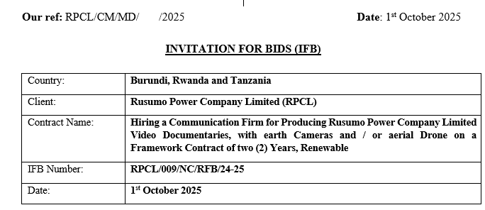 - Rusumo Power Company Limited (RPCL) now invites sealed bids from eligible and qualified Communication Firm for Producing Rusumo Power Company Limited Video Documentaries, with earth Cameras and / or aerial Drone on a Framework Contract of two (2) Years, Renewable.